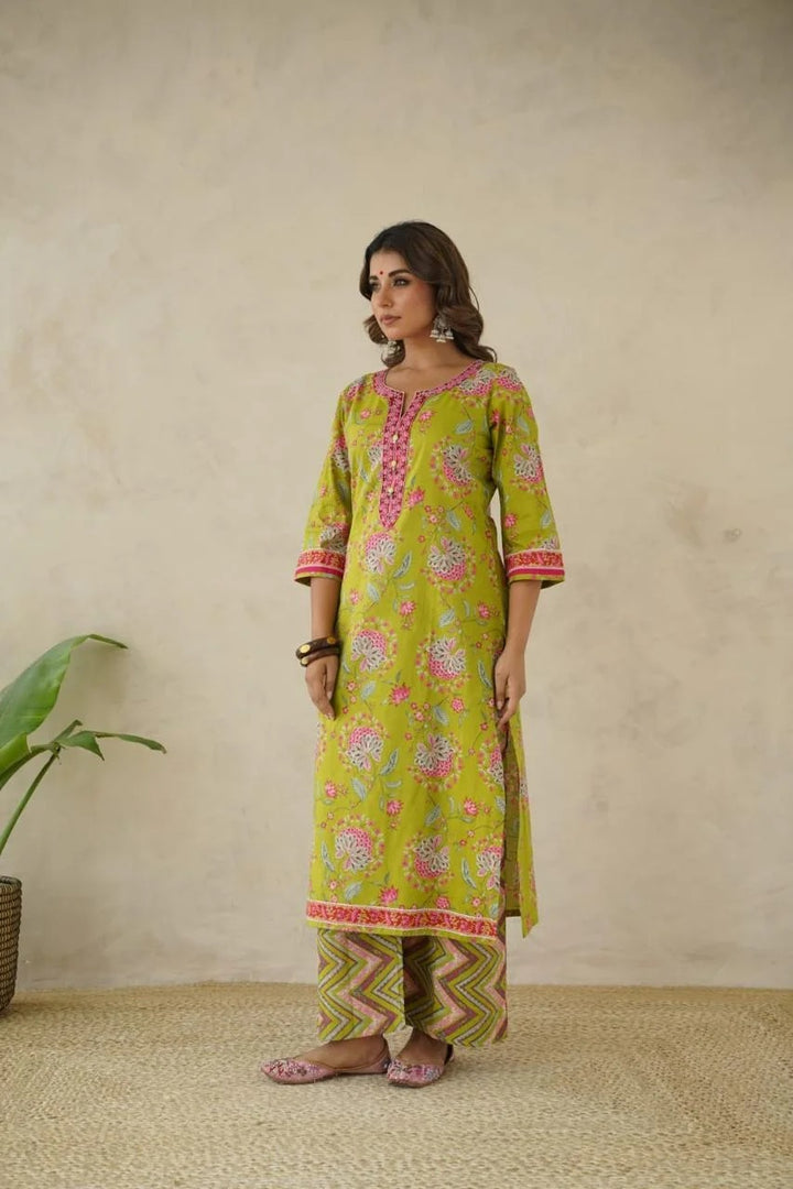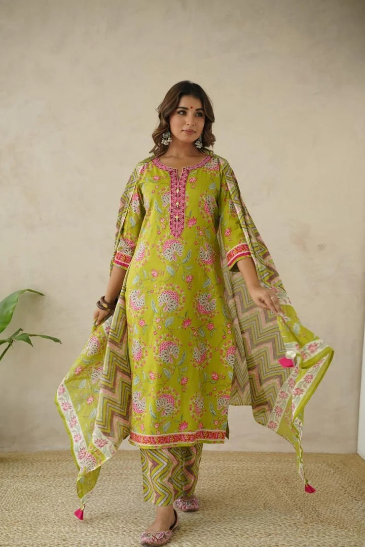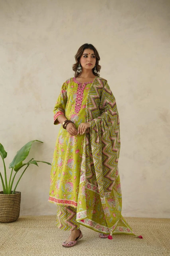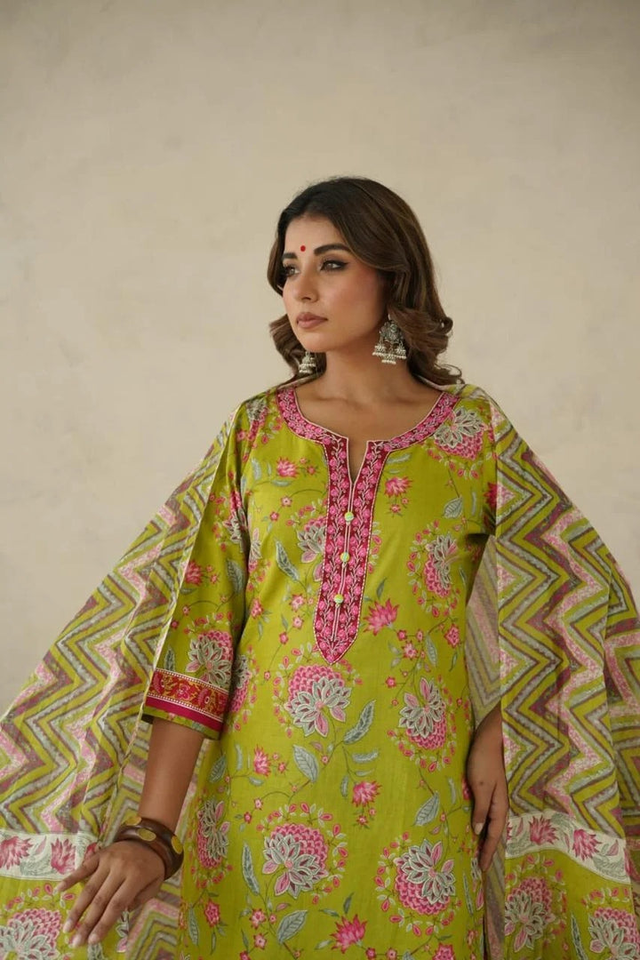 Bright, cheerful, and full of life — this lime green suit set captures the essence of effortless elegance. The kurta features delicate floral motifs in pink and grey, complemented by a contrasting magenta neckline adorned with buttons and intricate thread detailing. Paired with chevron-printed pants and a matching dupatta, it’s a perfect blend of vibrance and grace for day outings or festive brunches.